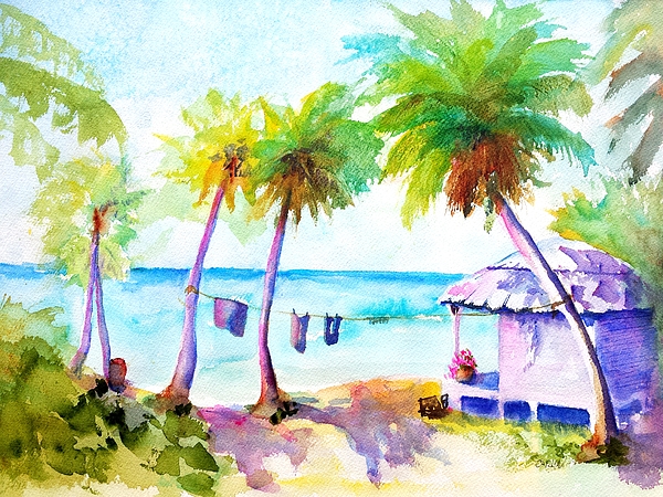 Indulge in a tropical paradise with this beachfront retreat watercolor painting by Carlin Blahnik, where worries fade away under the eternal sun.