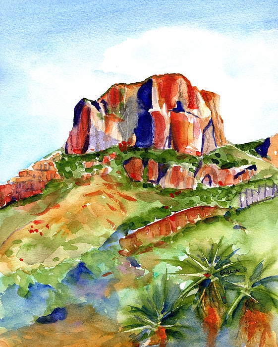 Transport yourself to the majestic landscapes of Texas Big Bend National Park with "Big Bend Casa Grande Peak" watercolor by impressionist artist Carlin Blahnik.